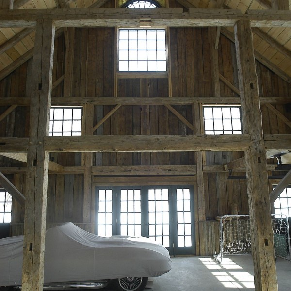 This 30′ x 34′ three story barn was designed around an 1840’s Vermont barn timber frame. The timber frame was raised on a new radiant slab and the fully insulated shingle facades were built with salvaged schoolhouse windows and new garage doors and sliding barn doors. Interior wall finish is the original barn siding. The intention was to leave the original barn frame and sheathing fully exposed to the interior, creating a very rustic finished space used primarily for parties.