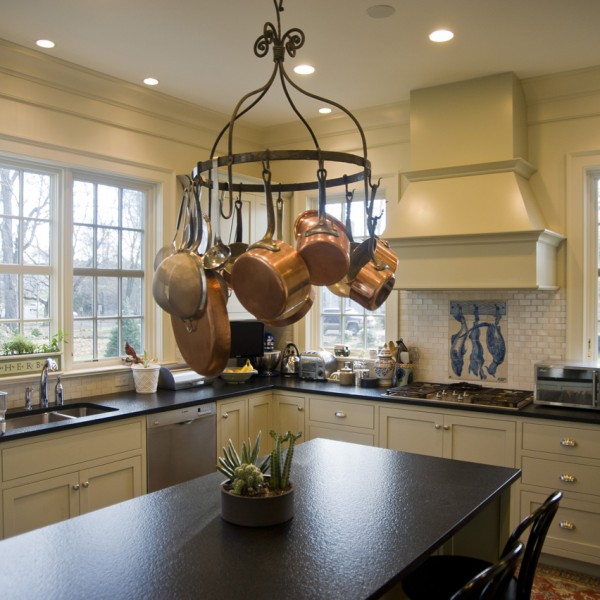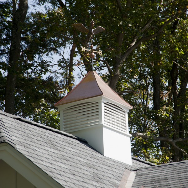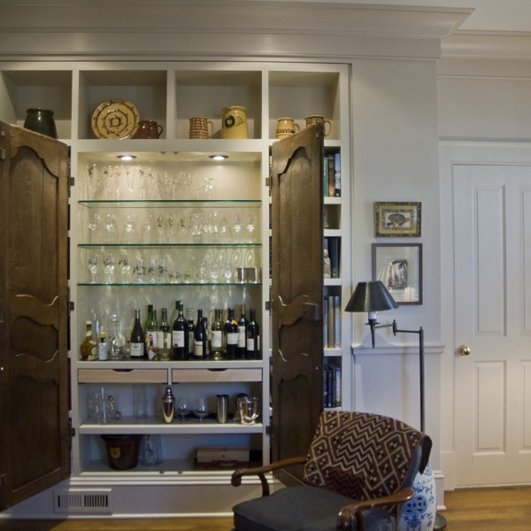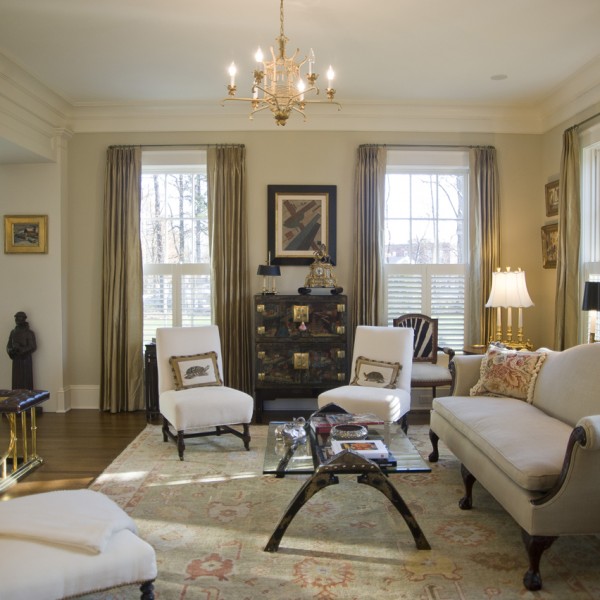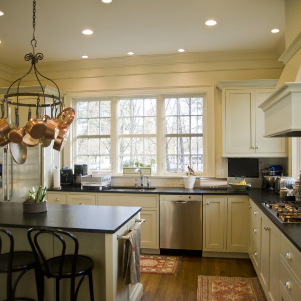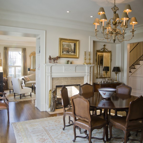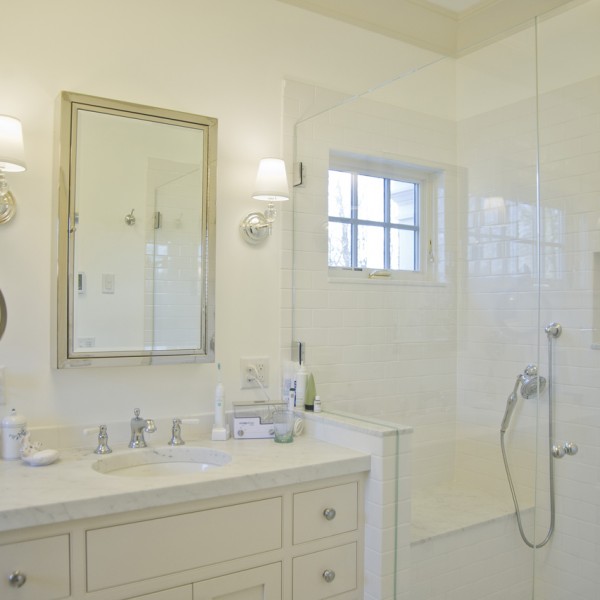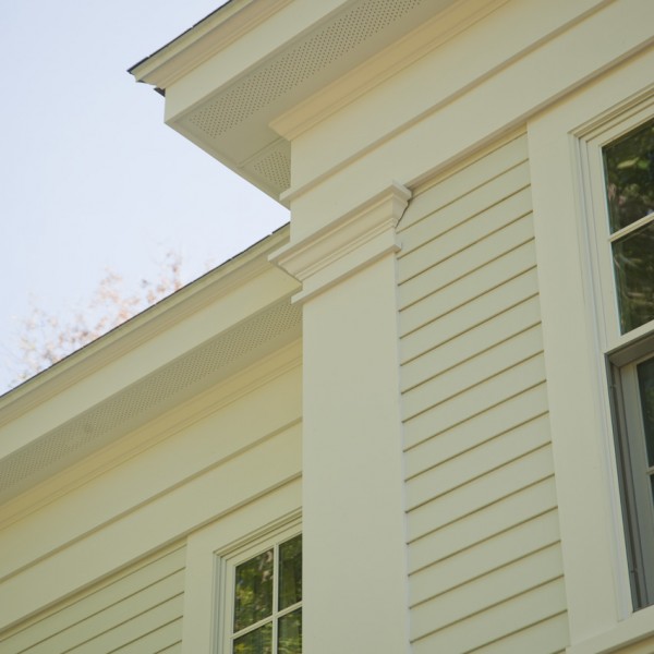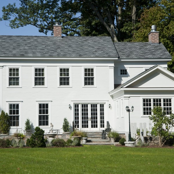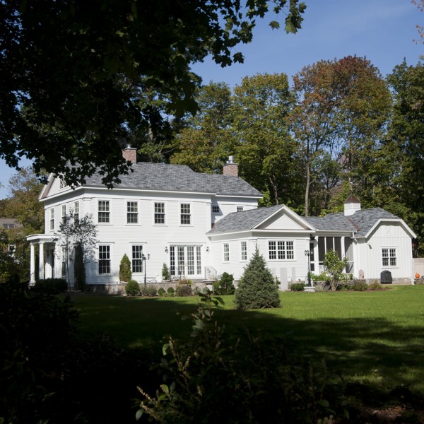 New residence on prominent one acre lot within the Lenox Historic District. The client and architect started with the concept of a Greek Revival house both elegant and pristine in its detailing. The front façade features a traditional pediment, half round window, and small front porch with round columns and dentil. The house was designed to appear as if it was expanded organically over time with a rear ell, a kitchen wing, and then a one car garage at the back. The garage was detailed with board and batten siding, a cupola, and modified hip roof to blend with neighboring 100 year old carriage barns. It also very clearly differentiates itself from the house, yet is connected by an open air screen porch structure which provides shelter entering the house and for outdoor dining. We also worked with the client to design interior finishes such as elaborate crowns and casings, custom kitchen cabinetry, raised paneling, herringbone floors, and traditional marble tile bathrooms.