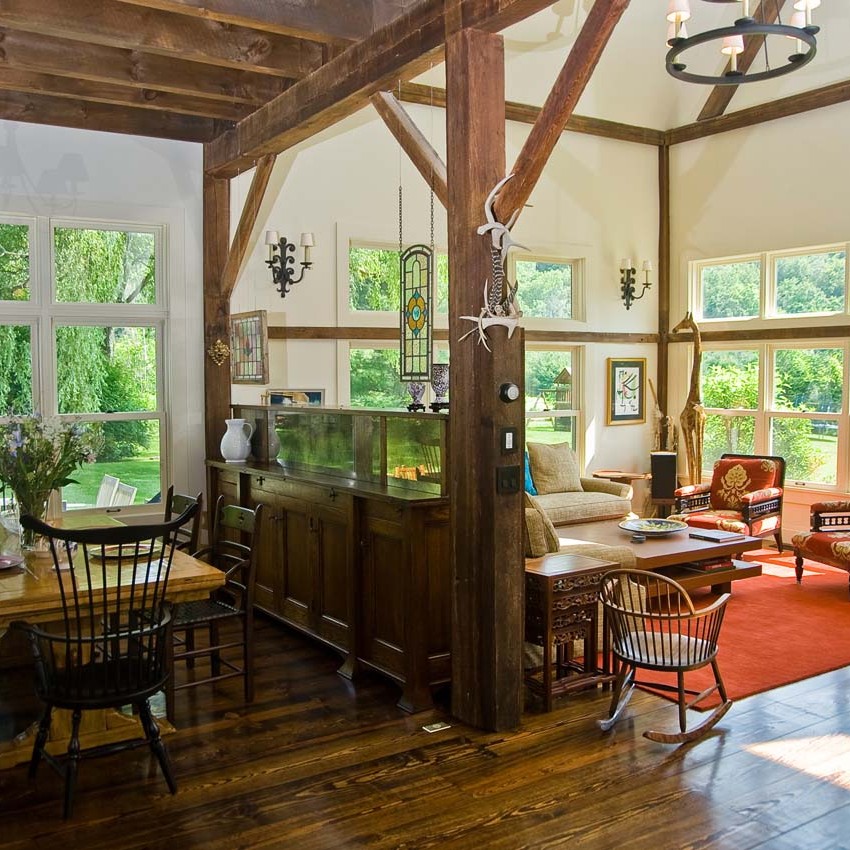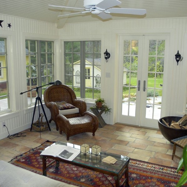 The program for the addition to this traditional New England farmhouse called for a heated sunroom with tray ceiling opening to a new deck and a one story bedroom suite. New rooflines matched the pitch of the original house and had to preserve existing second story windows.