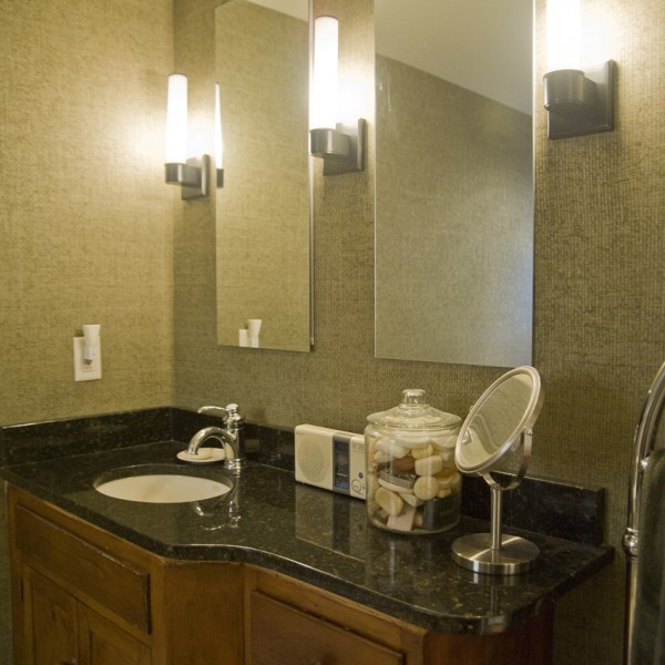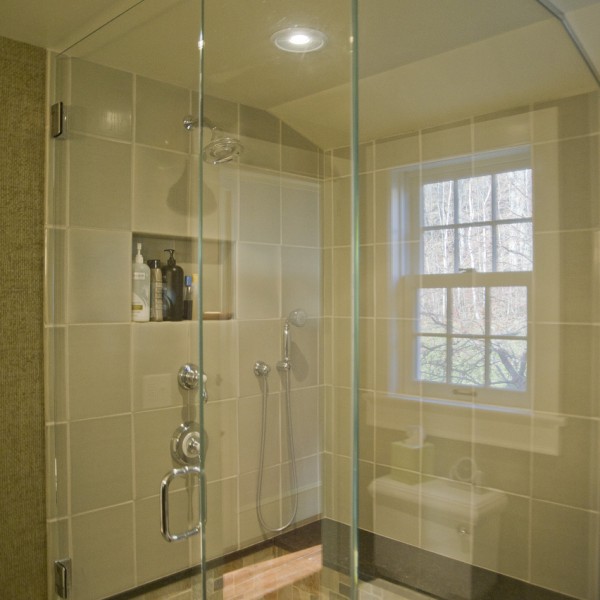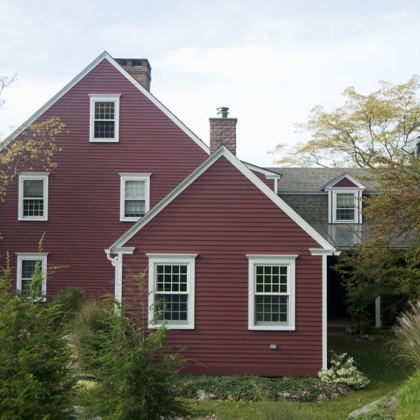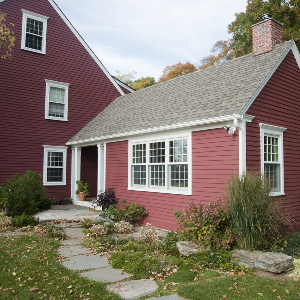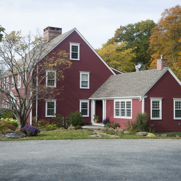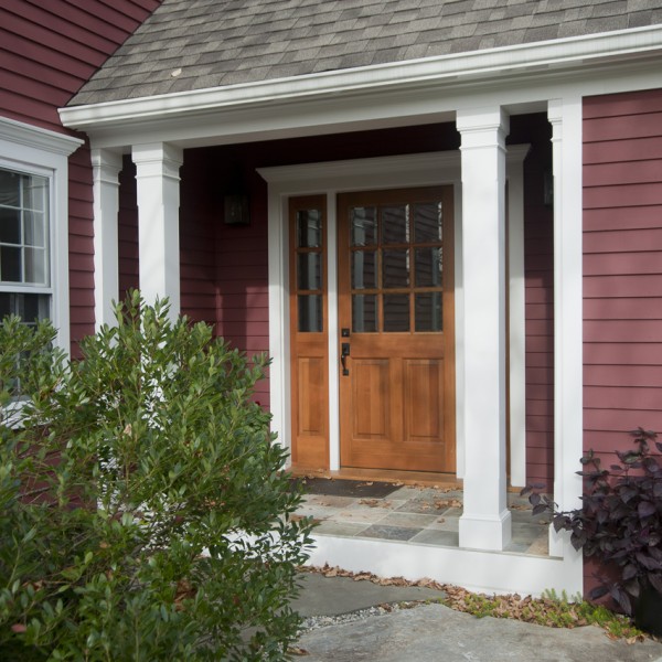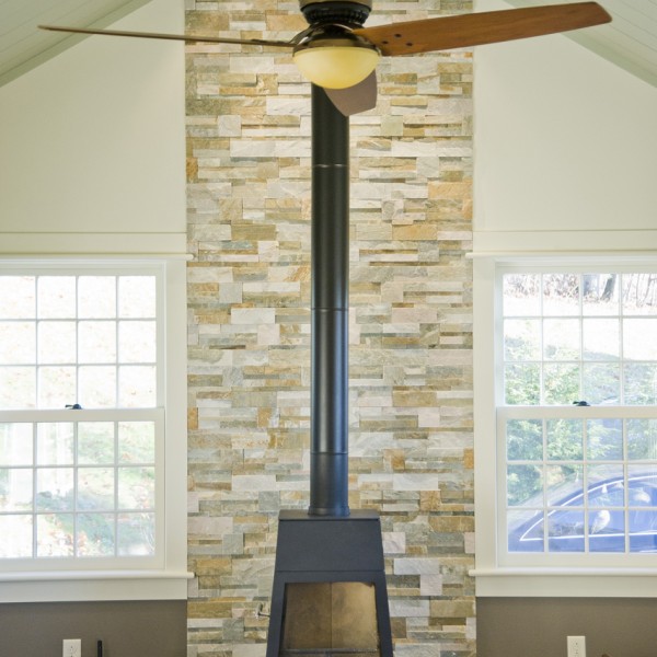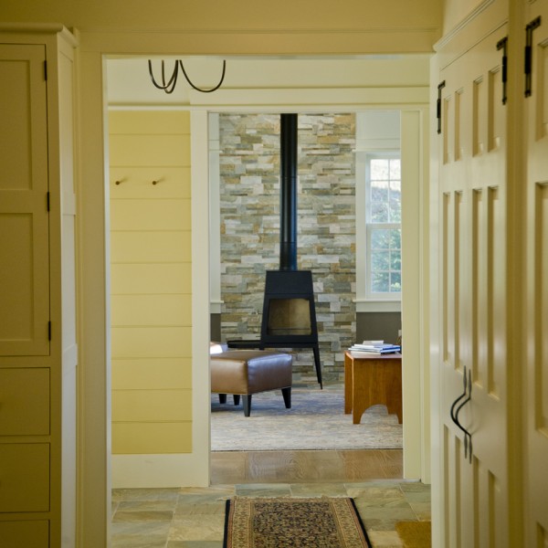 650 sf addition and renovation to a Colonial reproduction home. The addition primarily contains a large library/office space and an new formal entry space to better orient visitors to the main public areas of the home. Exterior features were replicated such as 12/12 double hungs, white trim, brick chimney, and steep roof pitch. Inside the cathedral ceiling space contains custom bookcases, wood plank ceiling, and a shaker wood stove. Interior Design by Karen Beckwith Art and Interiors.
